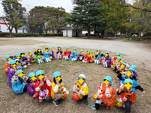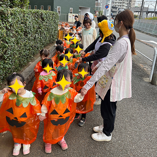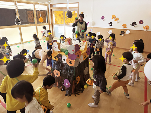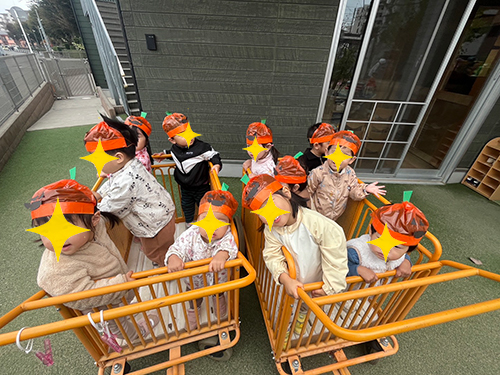 ホーム2025年11月ハロウィン🎃 ハロウィン🎃 今年のハロウィンはおばけに取られてしまったお菓子を取り返すゲームに挑戦しました!クラスのお友達と協力し無事にお菓子を取り返すことができました。 お菓子は公園やテラスで食べました。📸